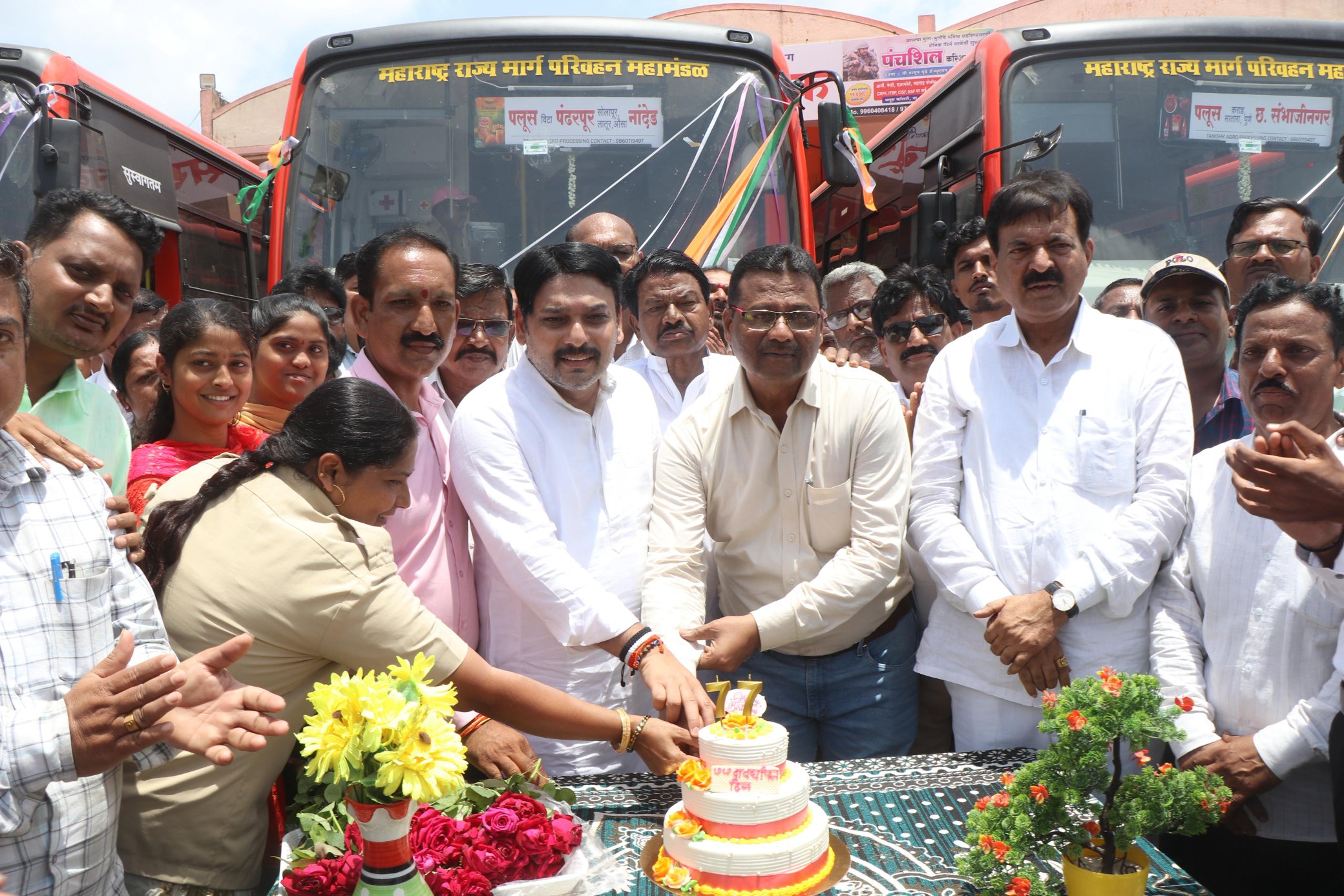 पलूस: सांगली जिल्ह्यातील पलूस बसस्थानकात महाराष्ट्र राज्य मार्ग परिवहन महामंडळाच्या (MSRTC) ५ नव्या बसेसचे लोकार्पण मोठ्या उत्साहात संपन्न झाले. या सोहळ्याला माजी मंत्री आमदार डॉ. विश्वजीत कदम, जिल्हा बँकेचे संचालक महेंद्रआप्पा लाड यांच्यासह इतर मान्यवर उपस्थित होते. याचवेळी MSRTC चा ७७ वा वर्धापन दिन केक कापून साजरा करण्यात आला.